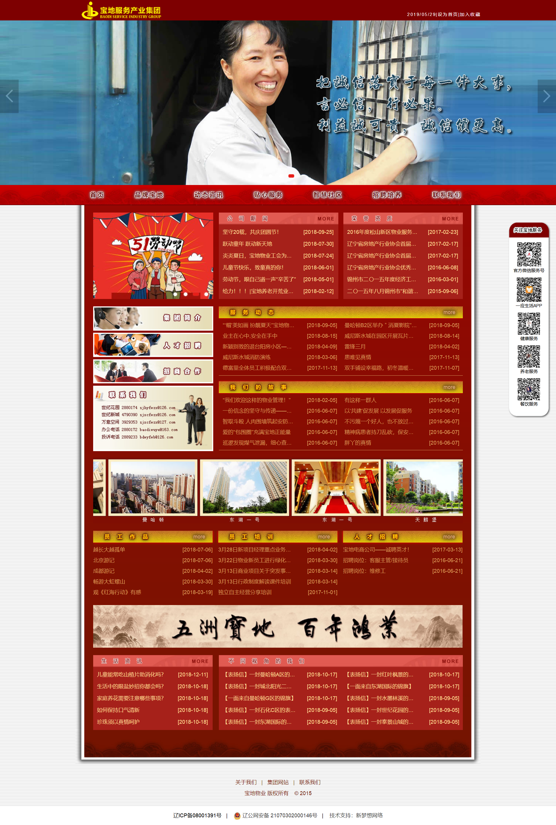 錦州寶地物業(yè)服務(wù)有限責(zé)任公司在錦城規(guī)?;^(qū)發(fā)展建設(shè)中應(yīng)運(yùn)而生,其成立于1998年,如今的寶地物業(yè)已經(jīng)是錦州唯一一家擁有國(guó)家一級(jí)物業(yè)服務(wù)資質(zhì)的物管服務(wù)企業(yè)。公司踐行“造福萬(wàn)家、創(chuàng)新發(fā)展、精進(jìn)成仁、自省自律、誠(chéng)信為本”的五行文化理念,以“您的滿意是我們永遠(yuǎn)的追求”為服務(wù)宗旨,力求為業(yè)主打造高品質(zhì)的物業(yè)服務(wù)。隨著公司規(guī)模的不斷壯大,目前公司現(xiàn)有員工2500余人,承接項(xiàng)目100余個(gè),其中涵蓋了普通住宅、辦公樓及商業(yè)綜合體項(xiàng)目等,總服務(wù)面積達(dá)到了1000余萬(wàn)平方米,其中世紀(jì)花園小區(qū)、巴黎豪苑小區(qū)、東方庭院小區(qū)、寶地城小區(qū)、曼哈頓小區(qū)、東湖一號(hào)等多個(gè)小區(qū)獲得國(guó)家、省、市優(yōu)秀示范小區(qū)等榮譽(yù)稱號(hào)。